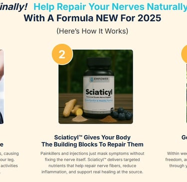 Sciaticyl Empower Health Labs is a natural supplement crafted to relieve sciatic nerve pain by addressing root causes like inflammation and nerve damage. It supports nerve regeneration, reduces discomfort, and restores mobility, helping ease lower back aches, radiating pain, numbness, and tingling, so you can move freely without sciatic limitations.